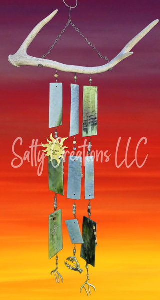 This beautiful, one-of-a-kind wind chime is approximately 27" long and 17" wide.