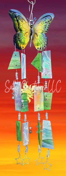 This beautiful one-of-a-kind wind chime is about 22" long and approx 6" wide.