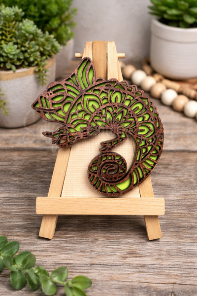 Bring a bold touch of nature and artistry to your space with this Mandala Chameleon Wooden Magnet. Expertly crafted from layered wood, this eye-catching piece features intricate mandala-style detailing that highlights the graceful curves of the chameleon’s form. The natural wood tones paired with vibrant backing create depth and dimension, making it a true statement piece on any magnetic surface.